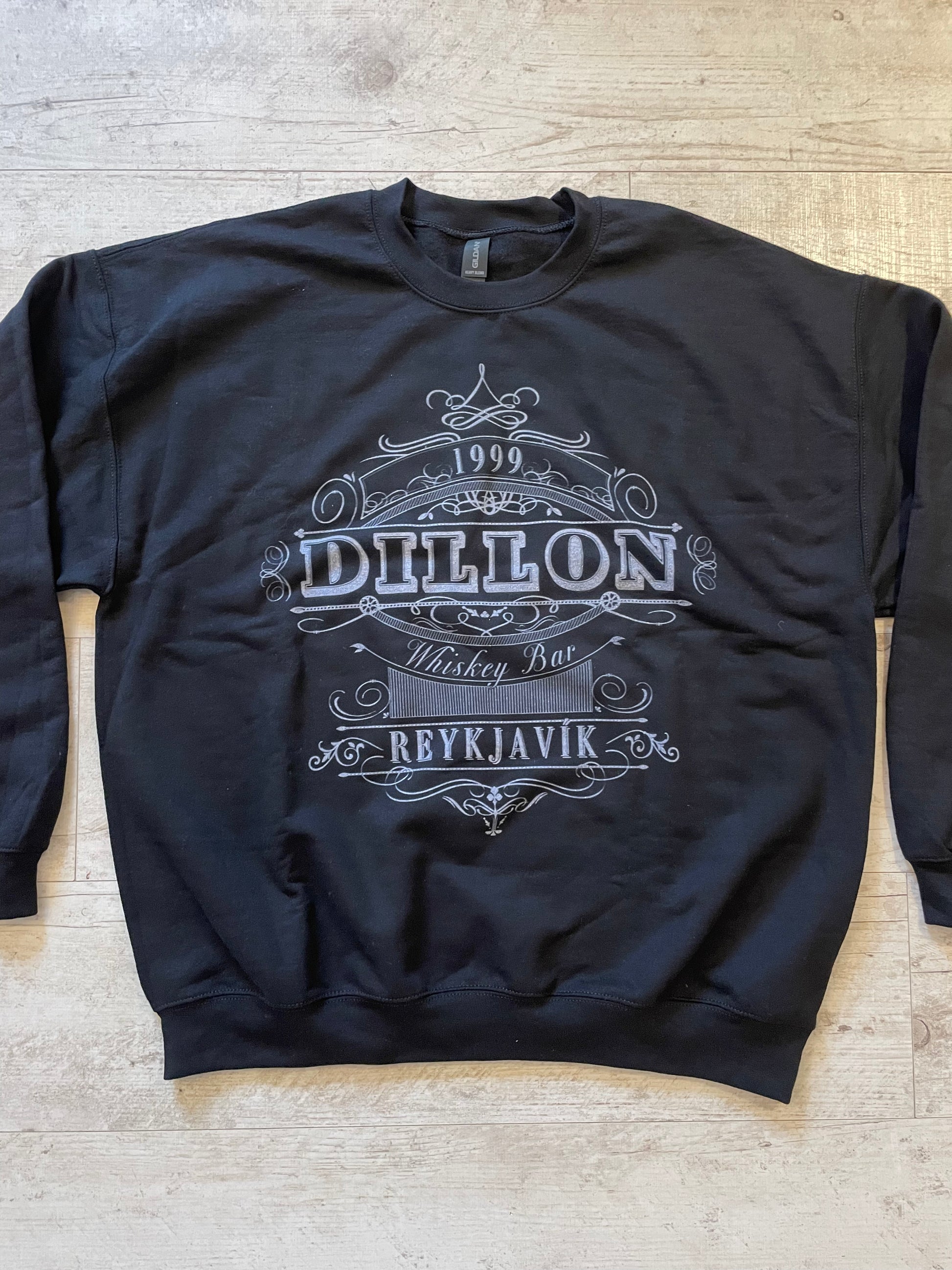 Black crew neck sweater with white Dillon Whiskey Bar logo.